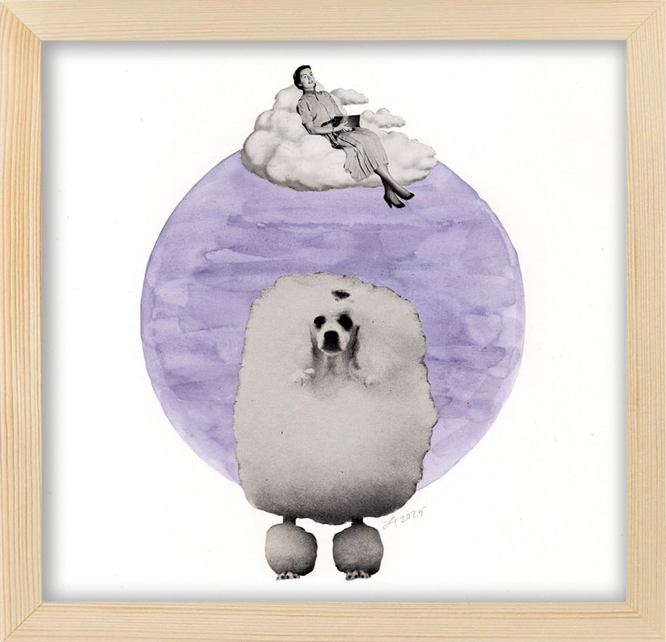 Original works on paper are watercolor with collage elements. These fun works can be displayed solo or in sets, and are set in natural wood frames with UV protectant glass.